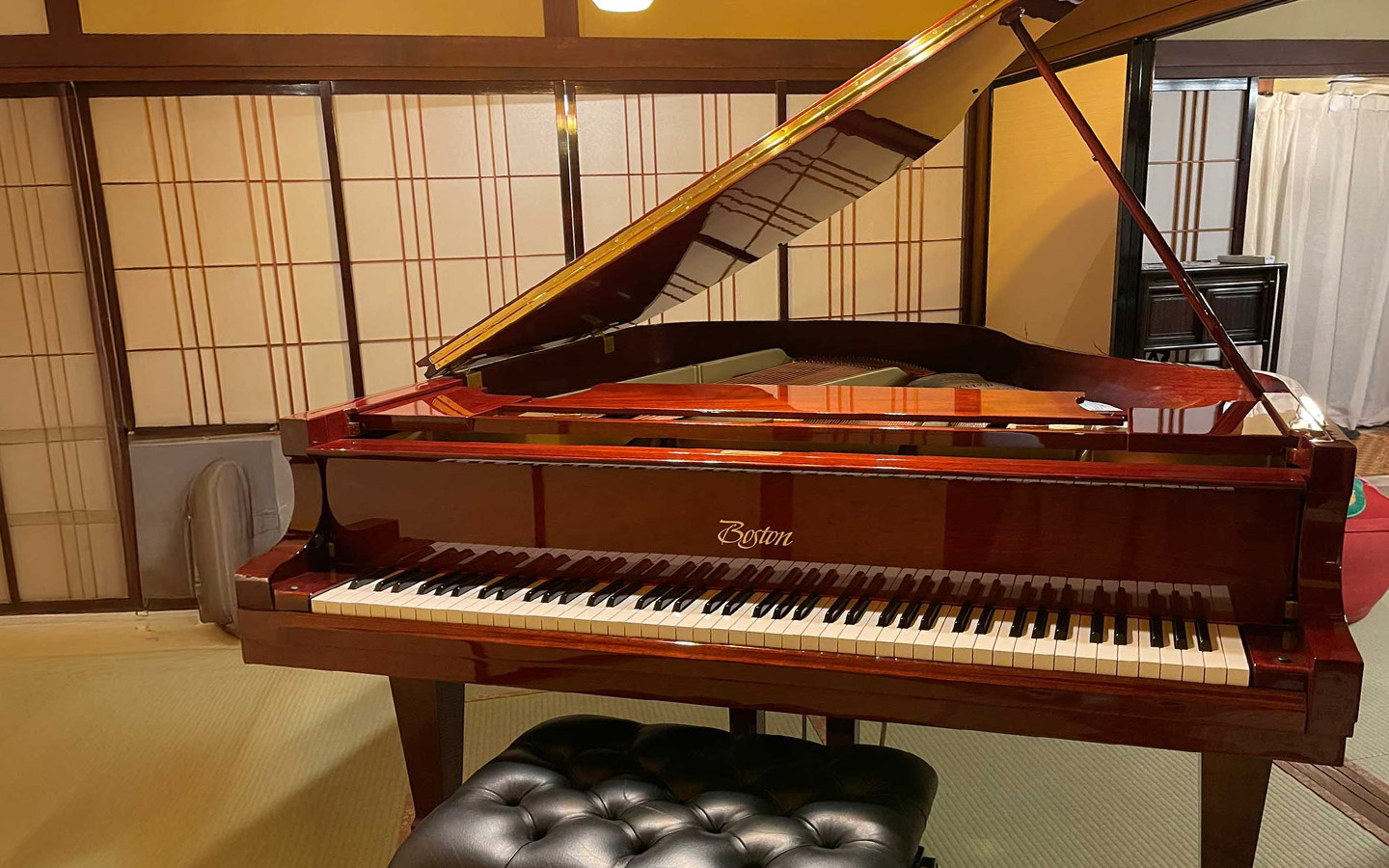 鮨山浦 はなれには、ワインレッドの木目をまとった ボストングランドピアノが佇んでいます。